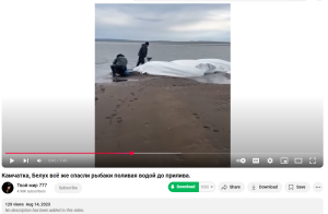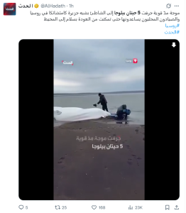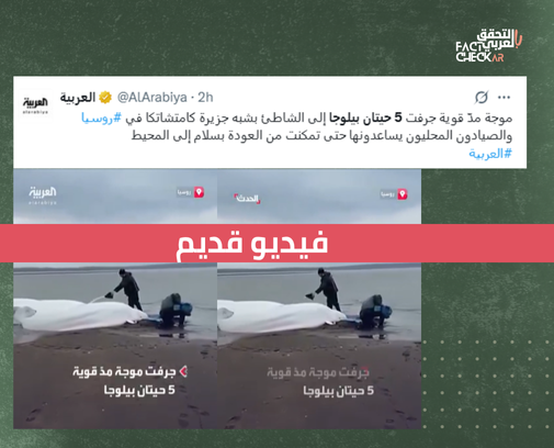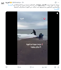 مقطع فيديو يُظهر حيتانا بيضاء على الشاطئ، مع تعليق:”موجة مدّ قوية جرفت 5 حيتان بيلوجا إلى الشاطئ بشبه جزيرة كامتشاتكا في روسيا، والصيادون المحليون يساعدونها حتى تمكنت من العودة بسلام إلى المحيط.”