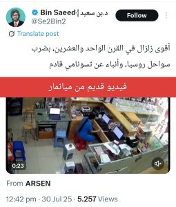 وانتشر الفيديو مع الادعاءات بأنه مصور من زلزال جزيرة كامتشاتكا في روسيا، مرفقا بتعليق:”أقوى زلزال في القرن الواحد والعشرين يضرب سواحل روسيا، وأنباء عن تسونامي قادم.”